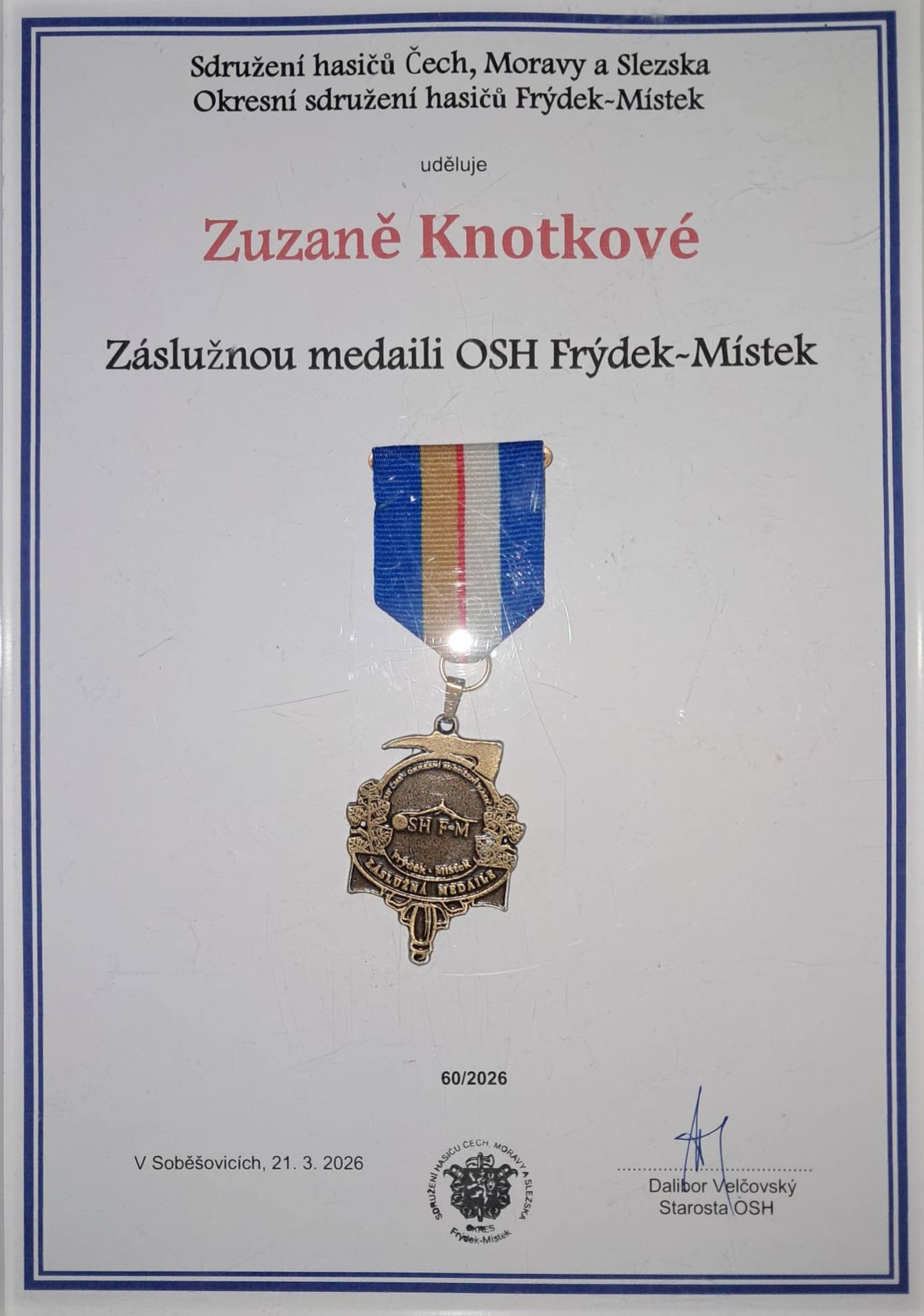 Záslužná medaile pro Zuzanu Knotkovou