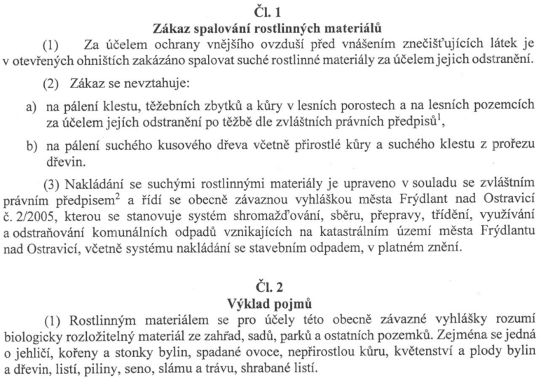 Upozorňujeme, že ve městě Frýdlant nad Ostravicí platí Obecně závazná vyhláška č.01/2017, kterou se stanovuje zákaz spalování rostlinných materiálů na území města Frýdlant nad Ostravicí. viz výňatek z vyhlášky...